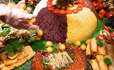 铺满紫米饭、烤鱼、鬼鸡、烤肉、野菜
