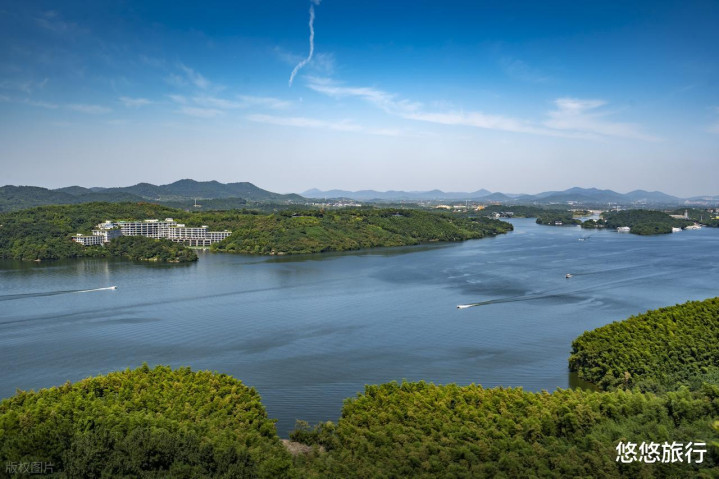天目湖山水园,由几个岛构成,爬上山鸟瞰总共天目湖就像一块玉石翡翠。