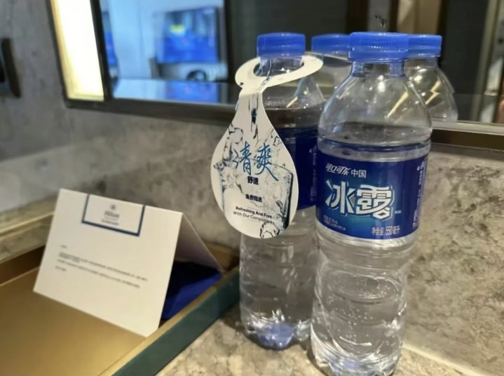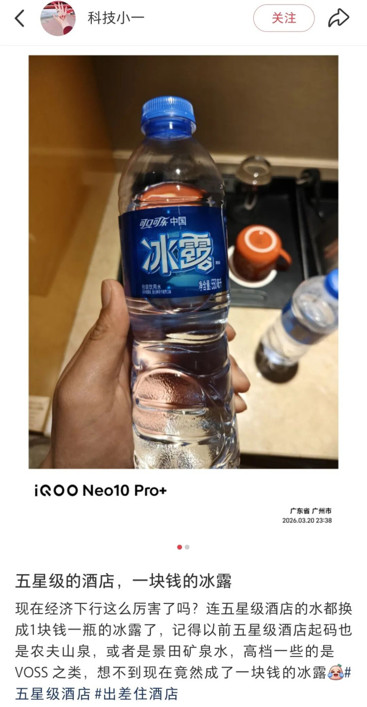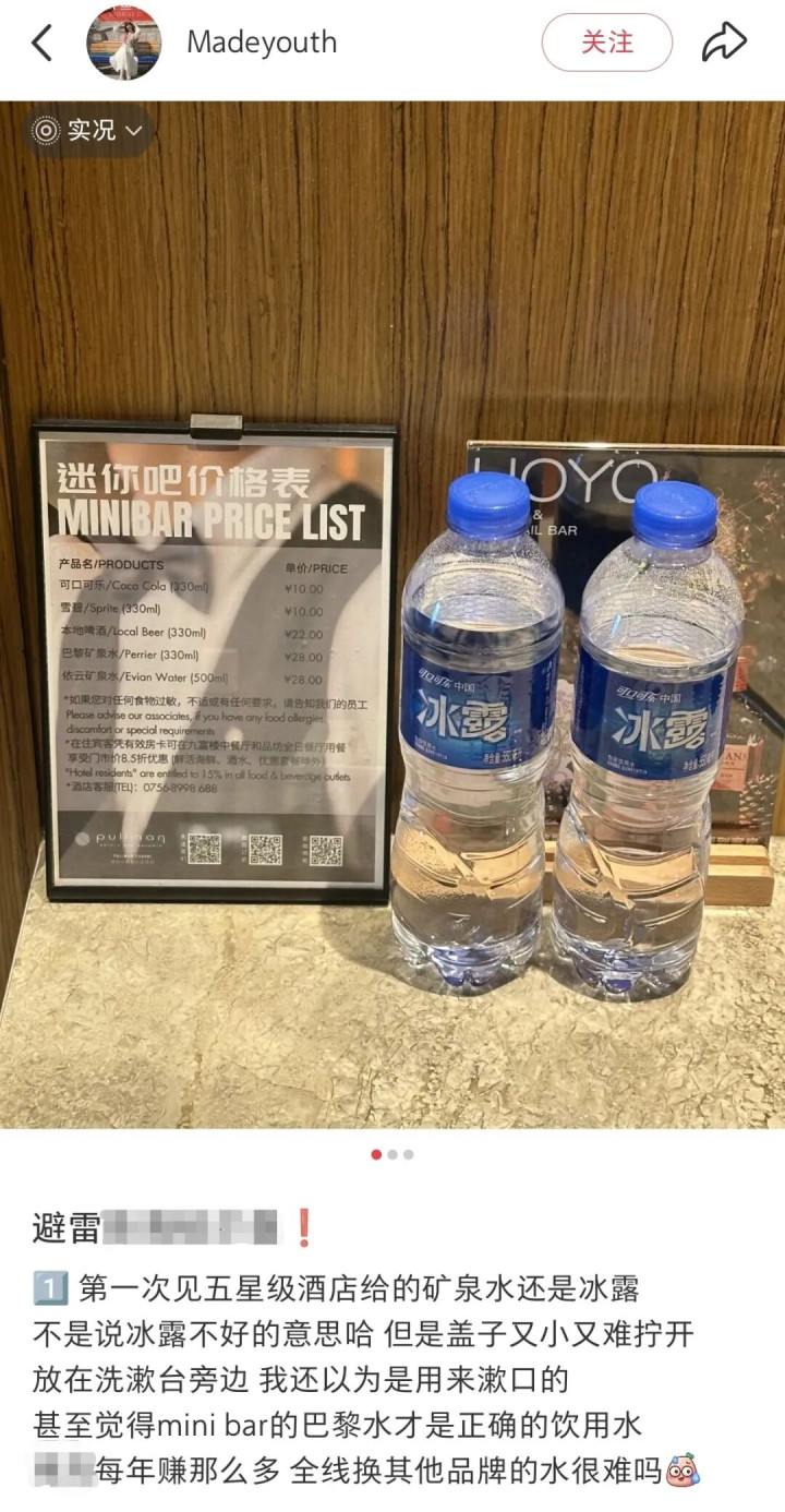 大堂依然珠光宝气,水晶灯吊得老高,大理石大地能照出东谈主影。可一进房间,掀开雪柜——冰露矿泉水幽静适静地躺在那儿。