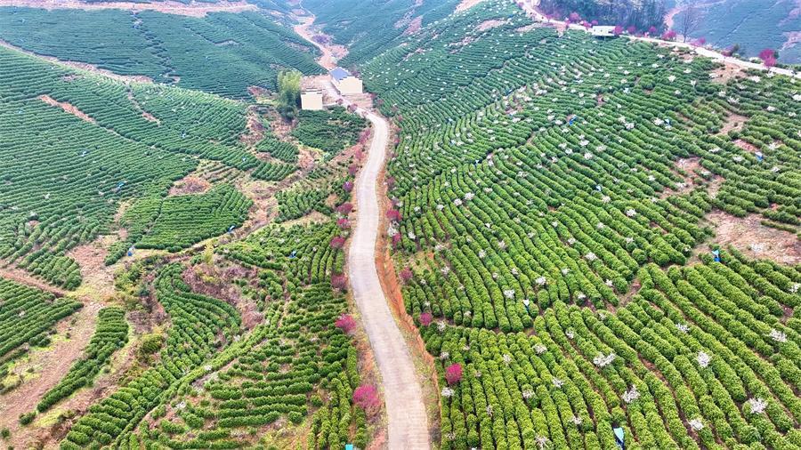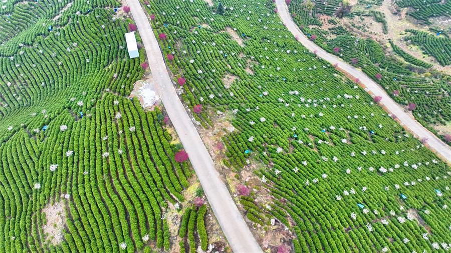 梅花点缀茶园间。东说念主民网 郭昊摄