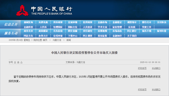 鉴于近期政府债券市集捏续供不应求,中国东谈主民银行决定,2025年1月起暂停开展公开市集国债买入操作,后续将视国债市集供求情景择机收复。