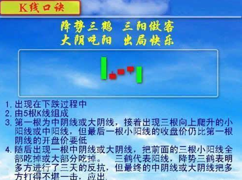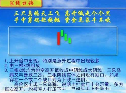 9、三只乌鸦天上飞,高开低走个个黑;手中筹码速即抛,资金见长牛不吹。