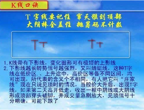 6、T字线要记着,窜天猴到顶部;大阴棒全盖住,抛筹码不计数。