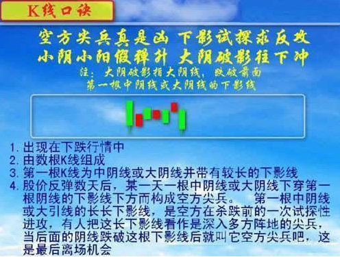 2、空方标兵确切凶,下影试洽商反攻;小阴小阳假弹升,大阴破影往下冲。(注:大阴破影是指大阴线,跌破前边第一根中阴线或大阴线的下影线)