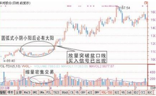 一个是在圆弧底位会出现密集交游区,(密集交游等于说不绝几天的K线黑白差未几);