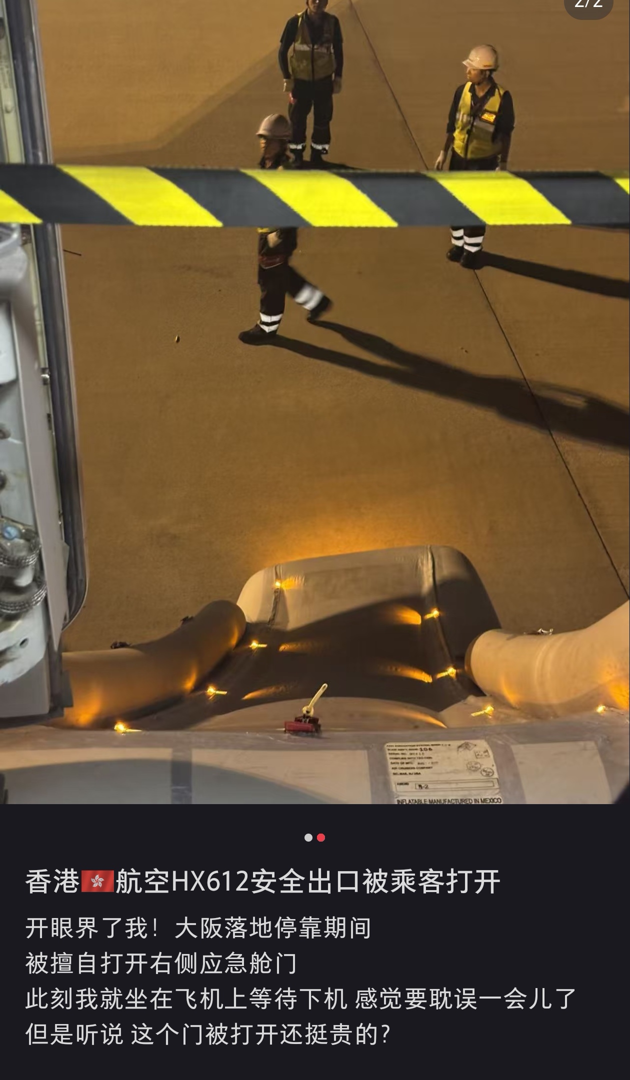 9月21日,有网友在外交平台爆料,称乘坐的香港飞大阪的HX612航班落地关西机场后,有乘客私行绽放右侧济急舱门,导致济急滑梯被放出 。