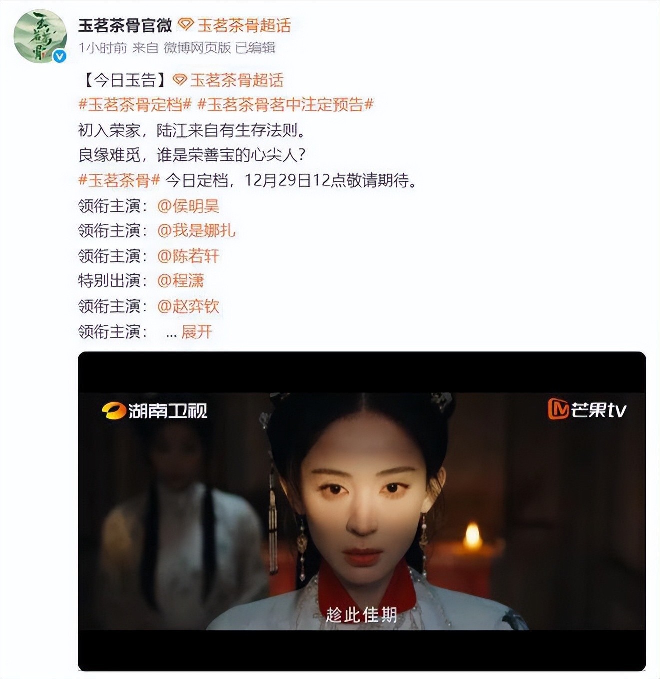 《玉茗茶骨》是一部以茶文化为配景的古装剧,剧中形色了古代茶叶制作、贸易通顺和王朝荣枯的故事。它不仅施展了一段逾越多个朝代的爱情外传,还展示了茶文化在不同历史技术的变迁与发展。在剧集的声势上,不仅有实力派演员加盟,还有好多年青新星的亮相。诸如张昊唯、李峋、王佳佳等演员的参与,预示着这部剧将是一部兼具艺术价值和生意价值的作品。