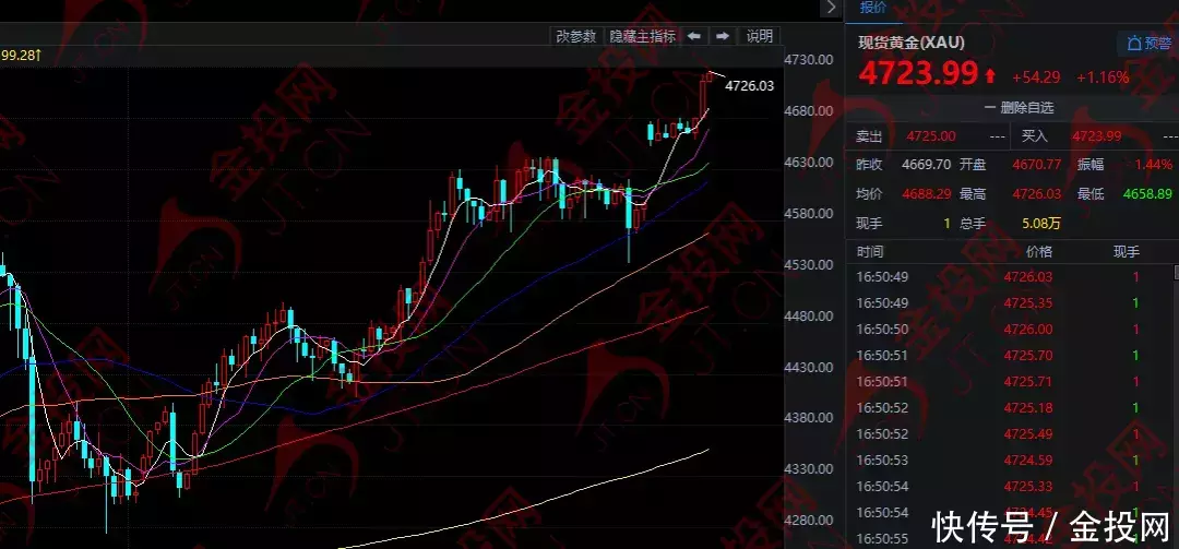 隔夜,受助于避险需求,现货金银双双创下记录新高,现货黄金一度触及4690好意思元,最终收涨1.64%,报4670.76好意思元;现货白银最终收涨4.69%赌钱app下载,报94.30好意思元。当天欧市盘中,黄金再革命高,持续暴涨至4731.32好意思元,当今在4724好意思元隔邻踌躇。