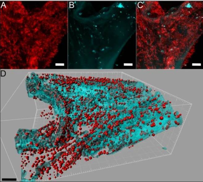 种类开阔的细菌险些在海绵中的各处均有散布;图中的红色代表细菌菌落,青色则是海绵的自觉荧光。