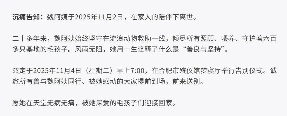 义工和网友风气称魏敏叫魏大姨,她是从2000年开动补助流浪狗的,本年仍是78岁。据媒体过往报谈,魏敏曾是别称司帐,退休后本不错靠着退休金过上相配餍足的晚年生存。可就在她退休那年,在环城公园散播时,却看见有东谈主把流浪狗扔进河里,令她萌生了要用余生来匡助这些流浪狗的念念法。其后驿站收容的流浪狗越来越多,她为筹钱顾问这些流浪狗,不吝廉价卖掉了在合肥市主城区的一套屋子。2024年夏天,魏大姨确诊癌症,本年11月2日祸害归天。