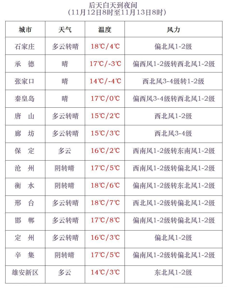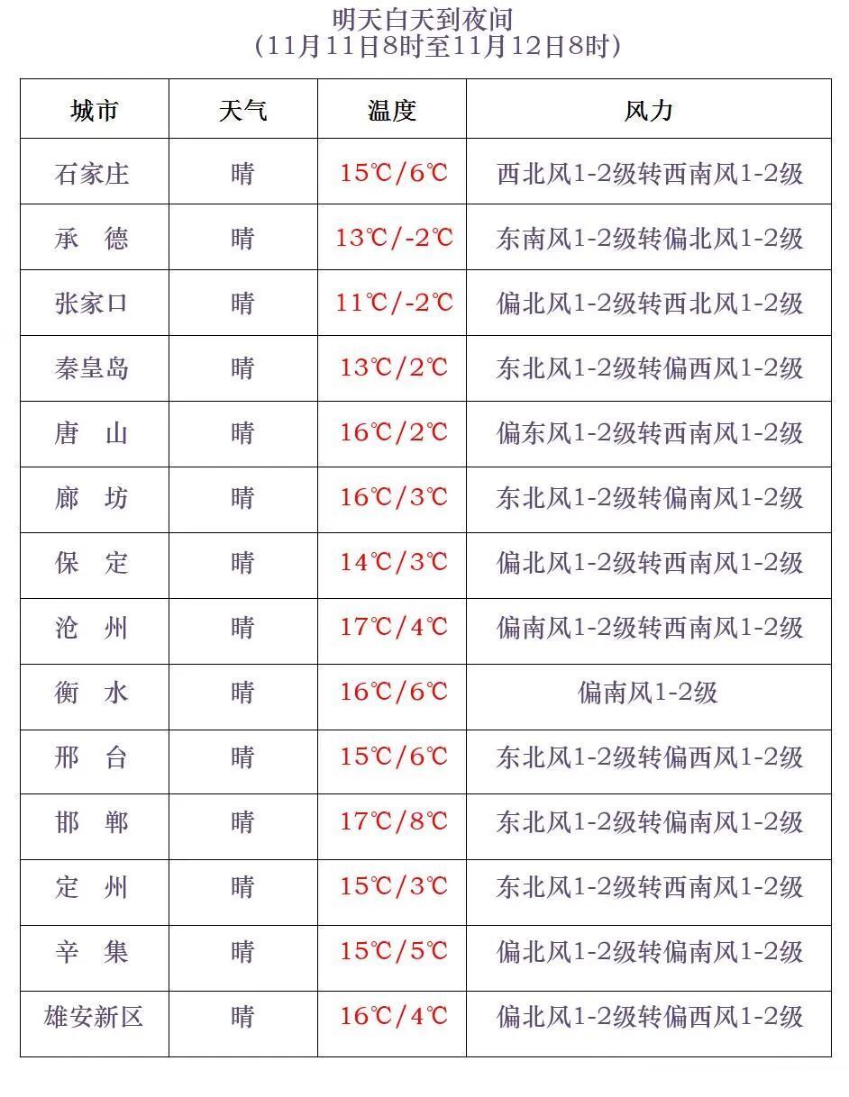翌昼夜间到12日,张家口、承德北部和保定、廊坊及以南地区多云间晴,其他地区晴间多云。12日白日,张家口、承德北部、保定西北部有西北风4到6级,阵风7到8级。