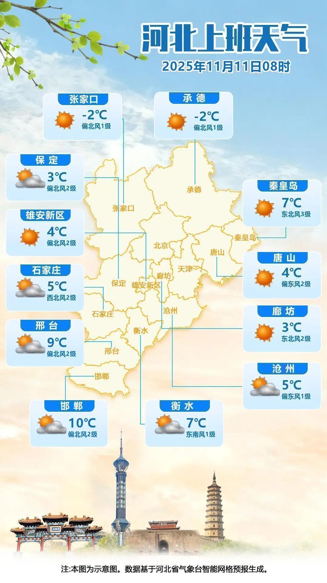 12昼夜间到13日,全省晴间多云。13日黎明,张家口、承德北部、保定西北部大部分地区最低气温下落2~4℃,局地下落5~6℃。
